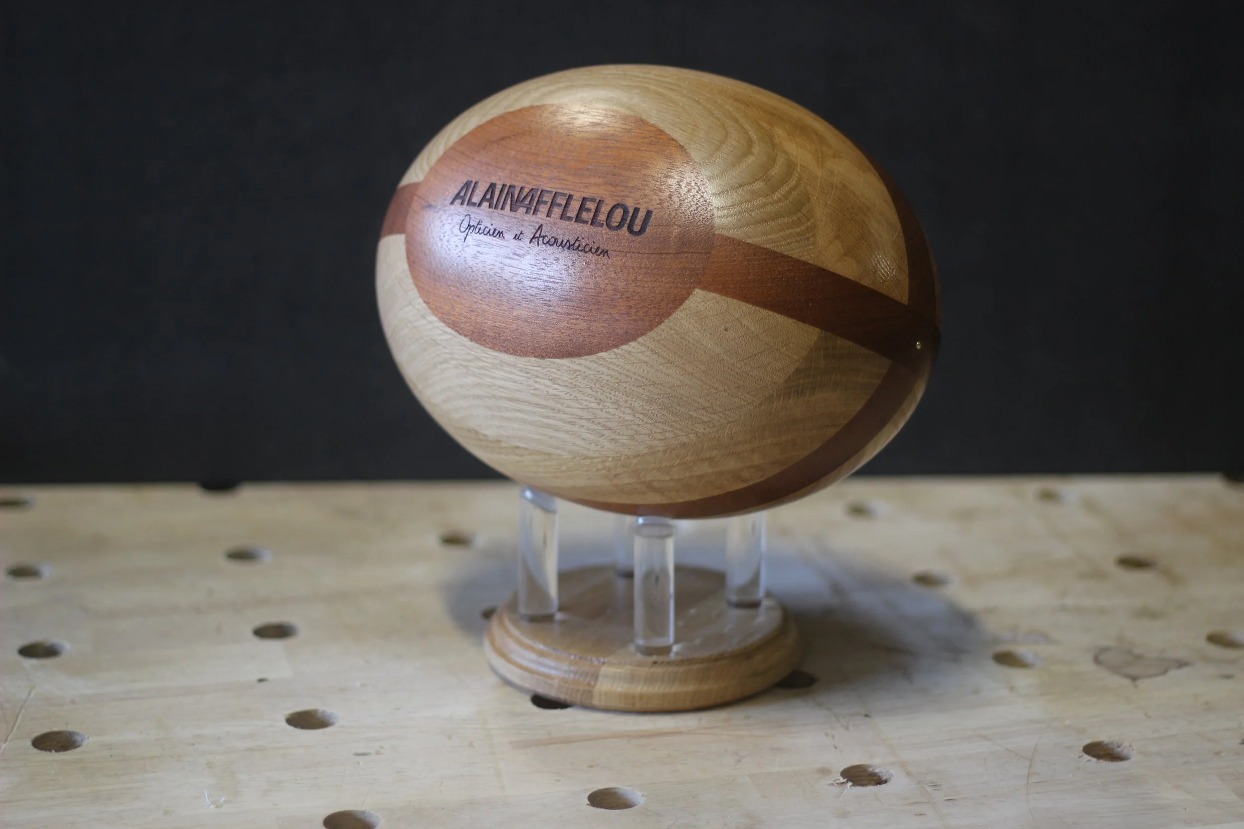Ce ballon en bois gravé, réalisé pour Alain Afflelou, transforme un symbole du rugby en véritable œuvre d’entreprise. Chaque pièce est fabriquée à la main et personnalisée pour refléter l’identité de la société qui la commande. Exposé dans vos locaux, il devient un marqueur fort de votre culture et de votre attachement aux valeurs du sport. Et parce qu’il s’agit d’une œuvre d’art originale, son achat peut ouvrir droit à une déduction fiscale pour les entreprises.